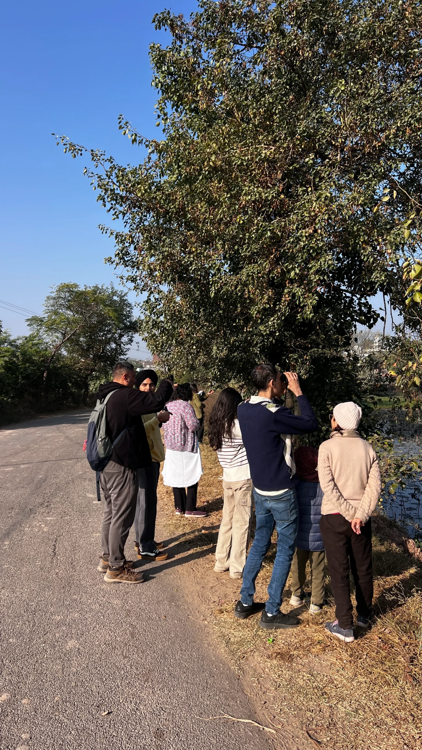 The surrounding agricultural fields and shrub-lined bunds offer foraging space for White-throated Kingfishers, Black Drongos, Indian Rollers, Red-naped Ibises, Pied Bushchats, and Siberian Stonechats, while the scattered groves and roadside trees support resident woodland birds such as Coppersmith Barbets, Spotted Doves, Laughing Doves, and Green Bee-eaters